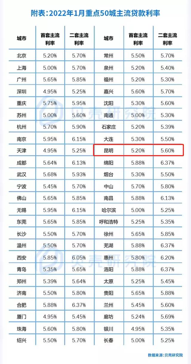 不过,去年10月以来,昆明房贷利率开始下探,至今年1月已降至5.2%左右。
