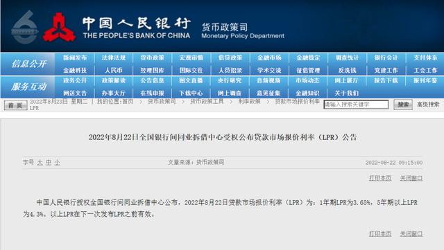 8月22日,中国人民银行授权全国银行间同业拆借中心公布,最新一期贷款市场报价利率,1年期LPR为3.65%,较之前的3.7%下调了5个基点;5年期以上LRP为4.3%,较之前的4.45%下调了15个基点。