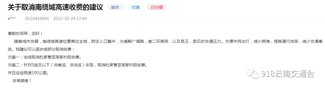 日前,有网友在人民网“地方领导留言板”发布关于“取消南绕城高速收费”的建议,表示南绕城高速位置靠近主城,附近人口集中,为缓解广福路、南二环高架,以及昆玉、昆石等公路的交通压力,方便市民出行,减少拥堵,建议逐步或部分取消南绕城高速收费。