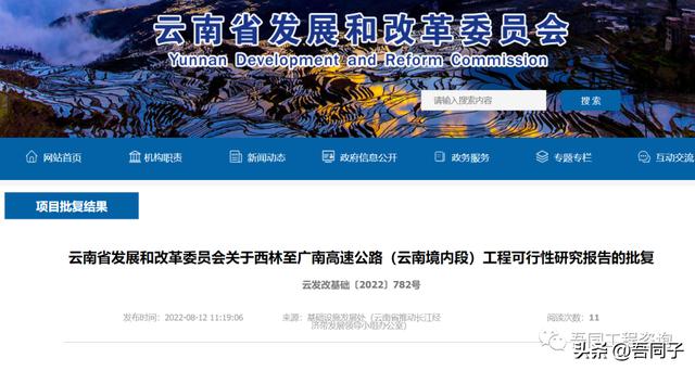 2022年8月12日,云南省发展和改革委员会网站发布“关于西林至广南高速公路(云南境内段)工程可行性研究报告的批复”。