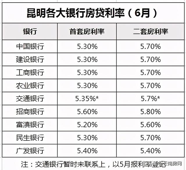 以首套房利率为例,云南房网了解发现,昆明市场9家主流银行现阶段平均利率水平为5.34%,略高于全国平均水平。中国银行、建设银行、工商银行、农业银行、民生银行和交通银行为5.3%,招商银行为5.6%,广发银行为5.4%,富滇银行为5.2%。