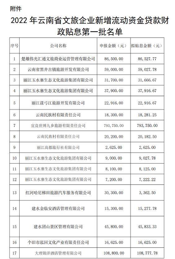 掌上春城讯8月11日,云南省文化和旅游厅对2022年云南省文旅企业新增流动资金贷款财政贴息第一批名单进行公示,18家企业拟获新增流贷贴息补助2358426.7元。公示期为5个工作日。