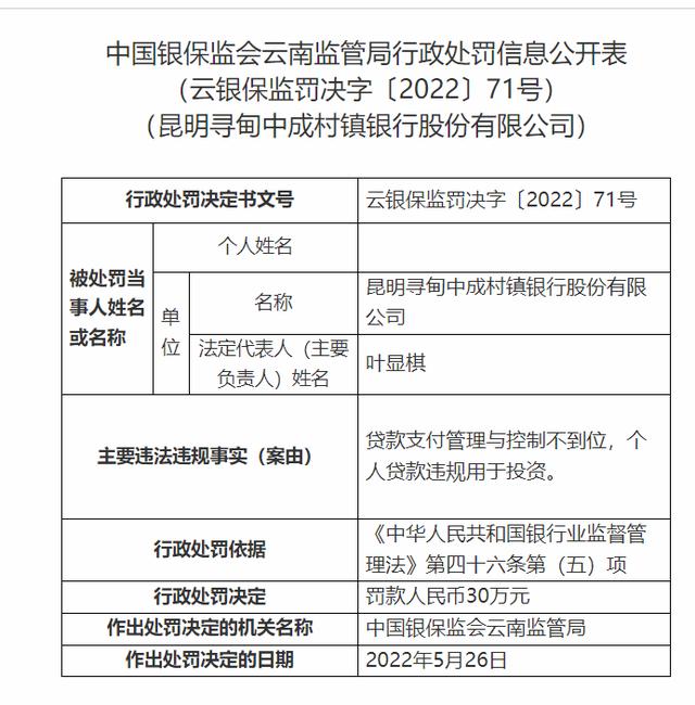 昆明禄劝中成村镇银行,由于违规办理借名贷款,被云南监管局处以30万元罚款;昆明寻甸中成村镇银行,贷款支付管理与控制不到位,个人贷款违规用于投资,被云南监管局处以30万元罚款;昆明石林中成村镇银行贷款支付管理与控制不到位,个人贷款违规用于投资,被处以30万元罚款。