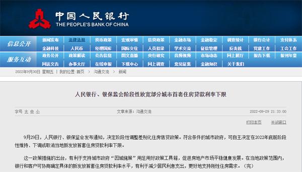 人民网北京9月30日电 (记者杜燕飞)人民银行、银保监会29日发布《关于阶段性调整差别化住房信贷政策的通知》(以下简称《通知》),决定阶段性调整差别化住房信贷政策。符合条件的城市政府,可自主决定在2022年底前阶段性维持、下调或取消当地新发放首套住房贷款利率下限。