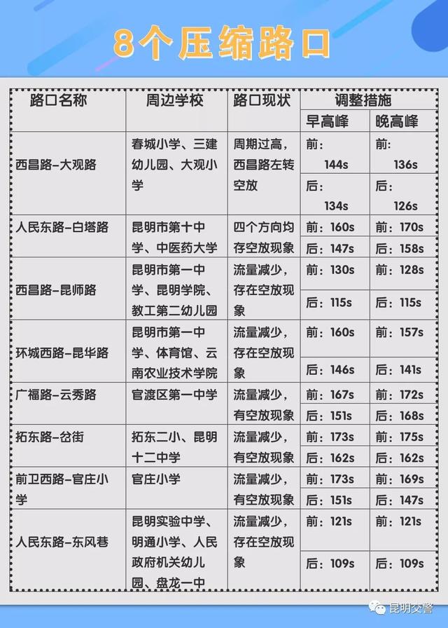 随着我市中小学陆续放假,学校周边路口车流量、行人数量有所下降,路口配时方案与实际运行情况不相符,昆明交警就主城区各学校放假前后路口车流、人流量变化情况,通过监控视频跟踪观察早、平、晚峰时段,分别对8个学校聚集点周边路口配时方案做出调整以及35个路口进行配时优化。