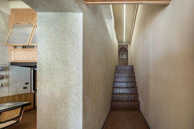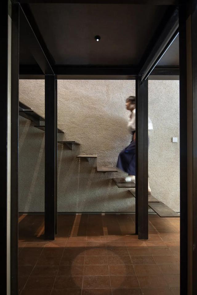 △ 从水洗石厚墙上悬挑出来的钢楼梯 ©唐徐国