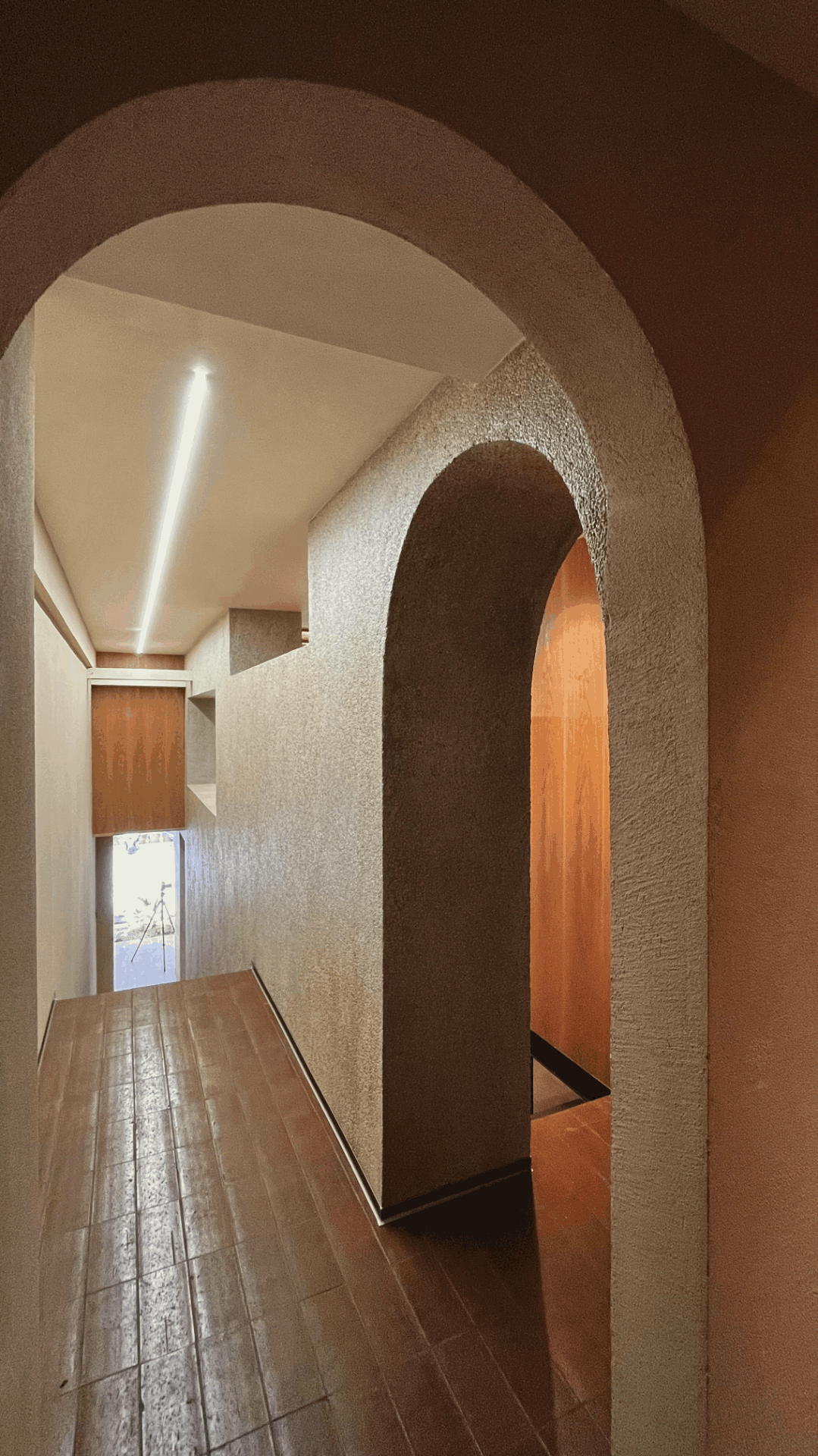 夹在一层小房子的厚墙与原始大盒子墙面之间的,是一段狭窄的楼梯,这段狭窄的楼梯将需要上楼的人带去二层空间,中间会经过一个半层平台,进行楼梯方向的转换。这既是与空间功能体块布局和层高相呼应的高差处理,同时也创造出了我们想在这里打造的“山有小口,仿佛若有光,从口入,初极狭,才通人,复行数十步,豁然开朗”的层层递进的行进体验,还是对前往勐海“深山老林”中茶山茶园的访茶之路的一种隐喻。