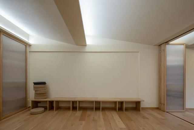 原始任务书中需要一个能容纳10-15人的多功能空间,可以做一些茶文化相关的交流活动,我们将这个空间设在了原始空间的2楼。因为这一层梁底净高太低(只有2.3米)且位于空间的较居中位置,所以我们做了一组折顶吊顶,将大梁隐藏于吊顶中,形成一个整体顶面,并在折顶吊顶的下口合适位置,安装了一组移门和一组折叠门的轨道,可以根据不同场景的使用需求,将移门和折叠门灵活开启,分隔出适合当时使用场景的空间。