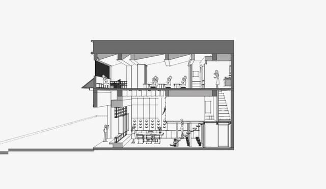 于是我们决定利用这较大的进深和层高,创造一个大盒子里有小房子,小房子里还有一个小木屋的“屋中屋”空间嵌套模型,并且小房子与小木屋都各自设有一套独立的楼梯,将人从上一层次的空间引入下一层次的空间。这样的设置既是空间语法上的一种嵌套,也是一种路径与目的地之间相关联的递进的暗示。