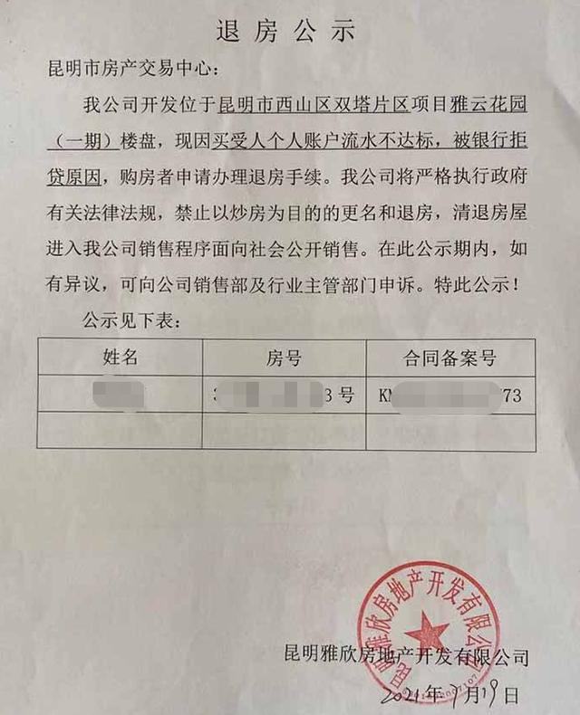 今年来,昆明就有不少购房者因银行流水不足、征信不稳定等原因,被银行拒贷而被迫退房。