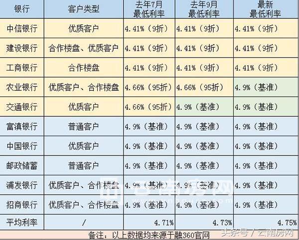 从融360官网最新数据来看,目前昆明10家主流银行中,只有中信、建设、工商三家银行可享受房贷利率最低9折优惠,其余7家银行均为基准利率4.9%。