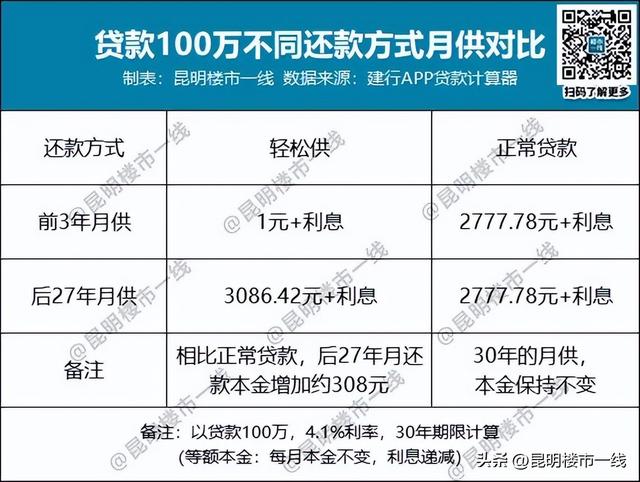 近日,建设银行云南分行推出购房“轻松供”还款方式。按此方式,前3年月供仅需:1元本金 当月利息。