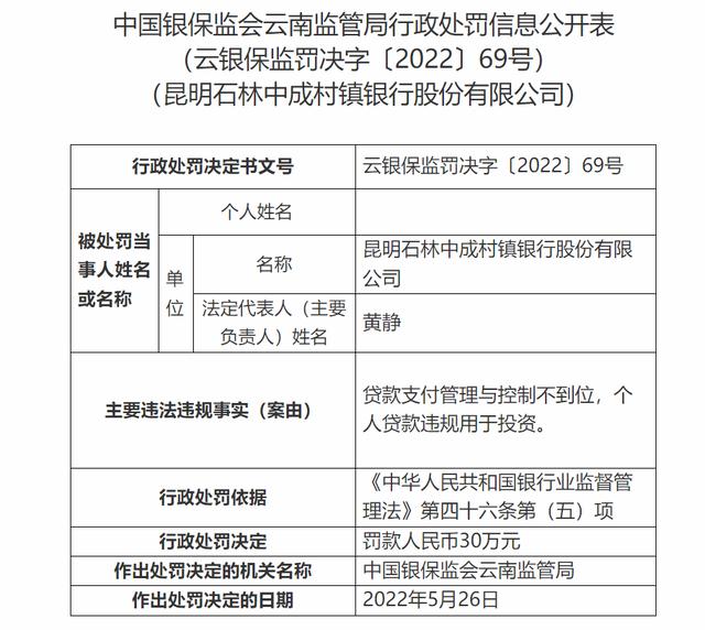 昆明禄劝中成村镇银行,由于违规办理借名贷款,被云南监管局处以30万元罚款;昆明寻甸中成村镇银行,贷款支付管理与控制不到位,个人贷款违规用于投资,被云南监管局处以30万元罚款;昆明石林中成村镇银行贷款支付管理与控制不到位,个人贷款违规用于投资,被处以30万元罚款。