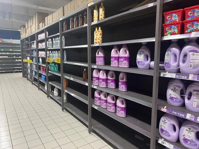 摆放食用油的区域、零食的区域、洗衣粉的区域、日常家庭用品的区域……很多区域的货架都空了很多。