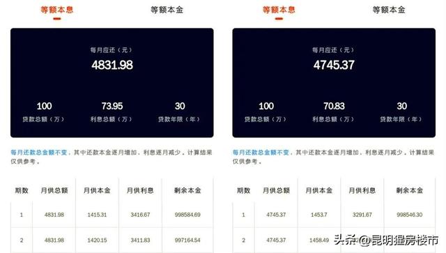 如果购买首套房,以贷款100万,30年等额本息还款为例: