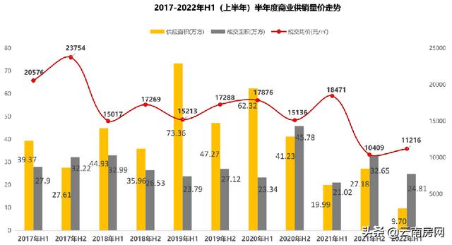 今年上半年,昆明商业呈供小于求的供销状态。累积供应9.7万方,销售24.81万方,环比小幅下降24%,却比去年同期小幅上升18%,成交均价11216元/平环比去年下半年,每平涨了约807元,涨幅约8%。