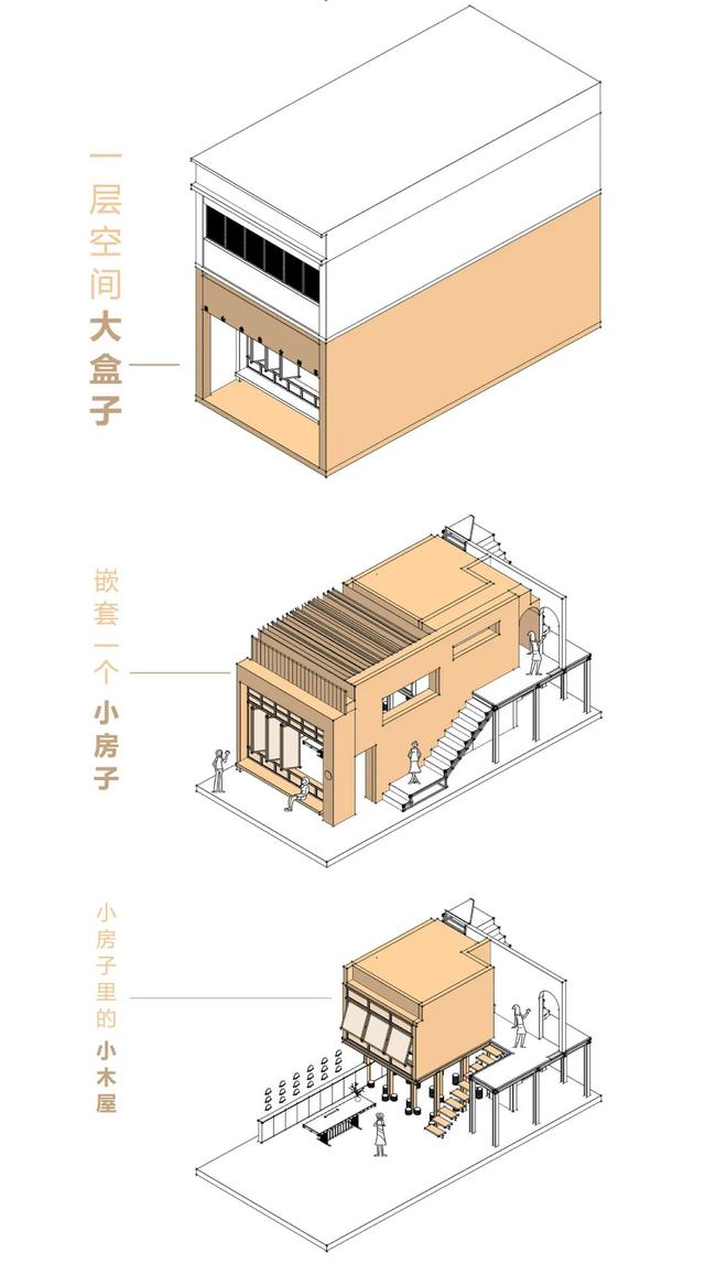 于是我们决定利用这较大的进深和层高,创造一个大盒子里有小房子,小房子里还有一个小木屋的“屋中屋”空间嵌套模型,并且小房子与小木屋都各自设有一套独立的楼梯,将人从上一层次的空间引入下一层次的空间。这样的设置既是空间语法上的一种嵌套,也是一种路径与目的地之间相关联的递进的暗示。