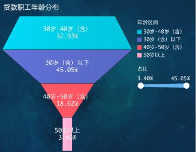 本年度贷款职工中,30岁(含)以下占45.05%,30岁-40岁(含)占32.93%,40岁-50岁(含)占18.62%,50岁以上占3.40%。