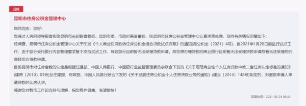 对此,8月24日,昆明市住房公积金管理中心回复:由于部分受托银行内部管理要求暂不支持个人商业性贷款转住房公积金组合贷款试点工作,导致部分银行目前暂无法受理贷款申请。