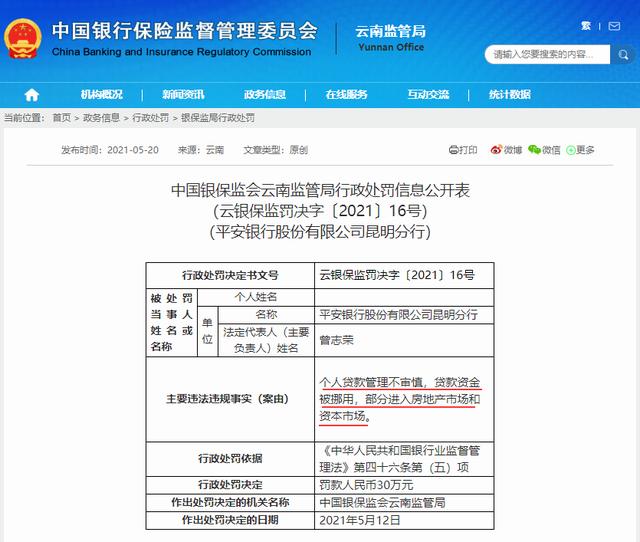 今年5月,平安银行昆明分行还因个人贷款管理不审慎,贷款资金被挪用,部分进入房地产市场和资本市场,被罚款人民币30万元。